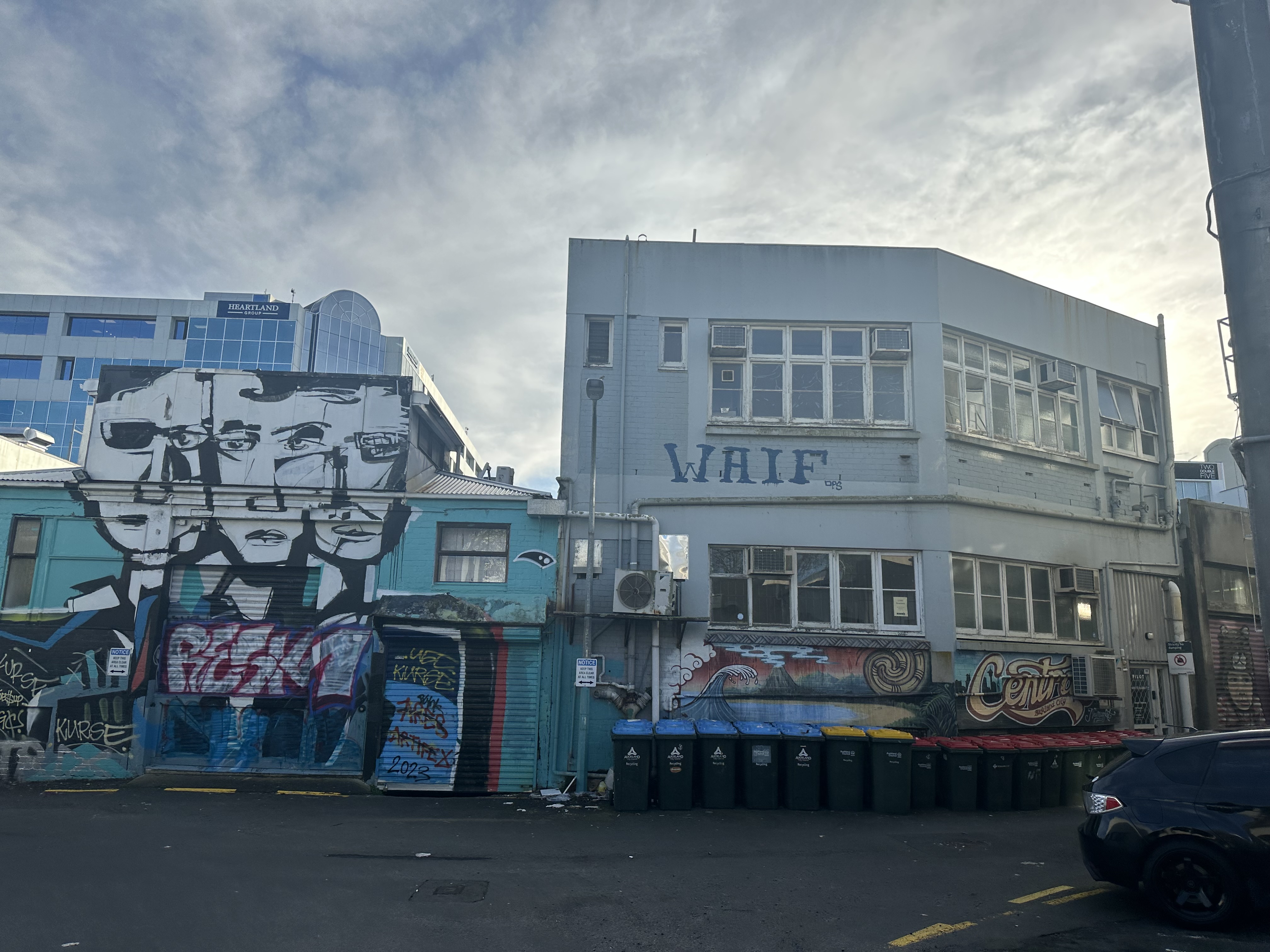 낙서투성이 벽 앞에 잠시 멈췄다.